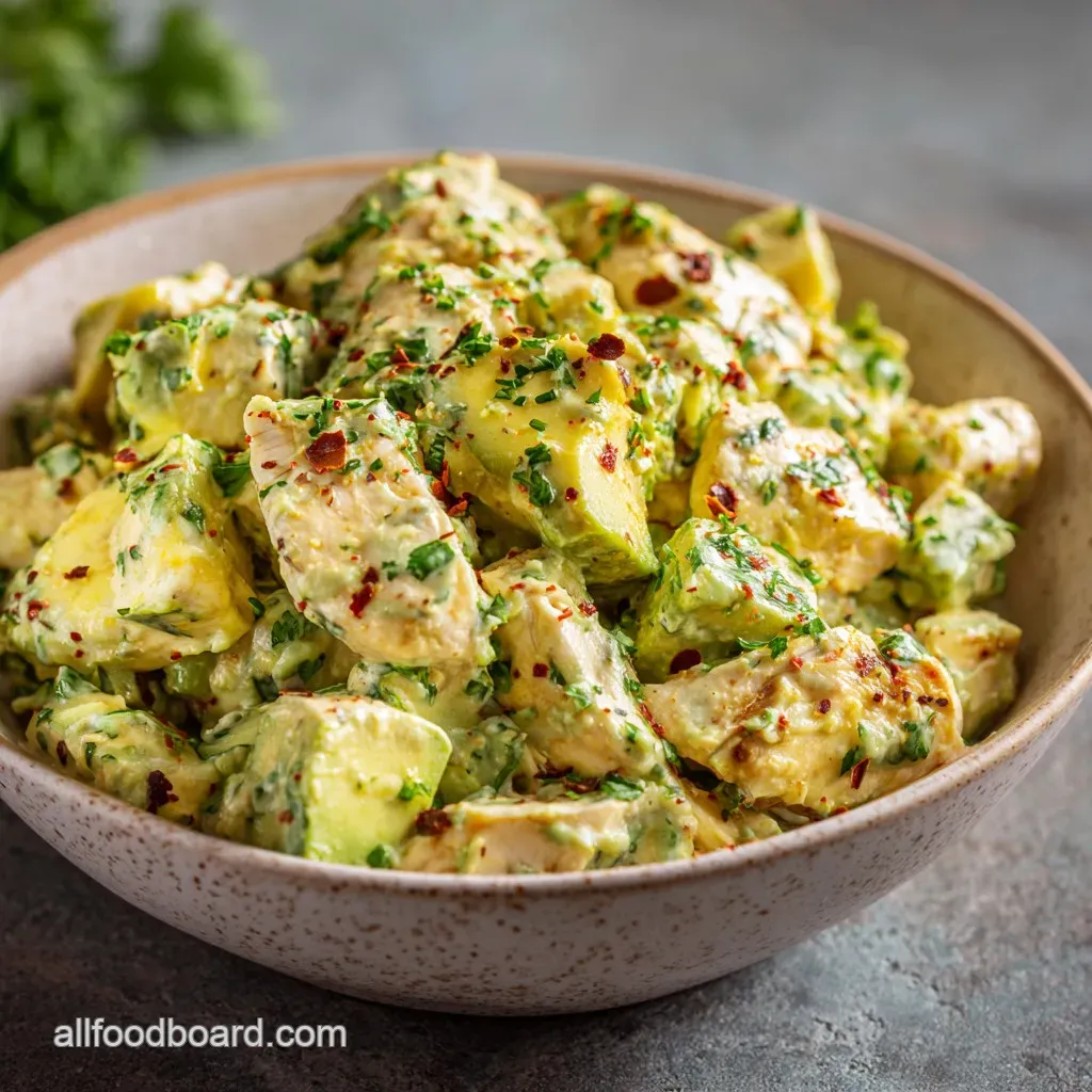 The secret to keeping this tasting rich, rather than like dry chicken mixed with green mush, is the combination of the mashed avocado and the acid (lemon juice) and a tiny bit of Dijon mustard. The Dijon doesn't overpower things; it just adds a subtle, savory tang that makes the texture feel more like a real dressing.