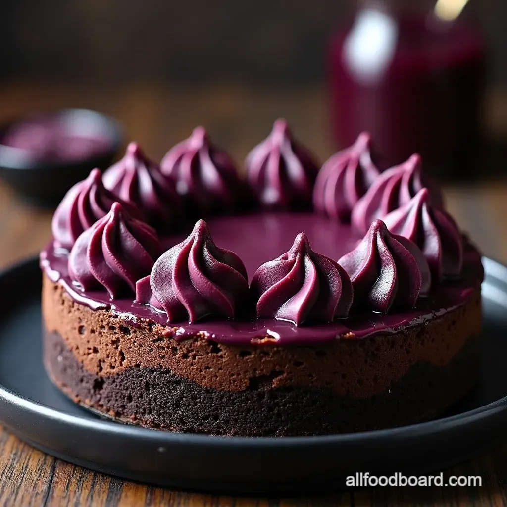 The baking process itself is part of the decoration, as the blackberry swirl defines the top. However, we save the final presentation for after the chilling period. Once fully cooled and set, the top can be lightly dusted with extra sifted cocoa powder—think of it as a light layer of "ash" resting on the surface of the potion.