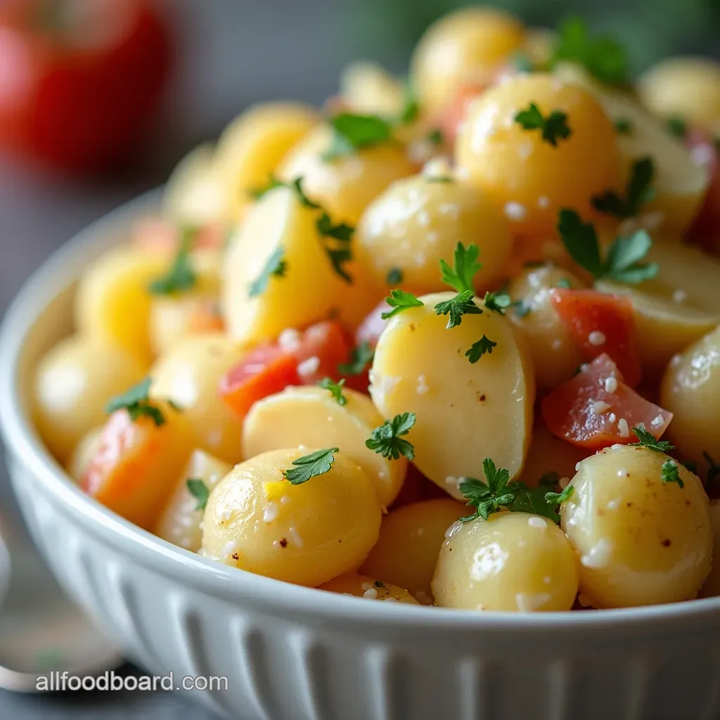 The celery and red onion must be minced finely; their purpose is to offer textural variance and a subtle, sharp aromatic background, not to dominate. Seasoning starts with the generous salting of the boiling water (2 tablespoons is key for seasoning the potatoes from within) and finishes with black pepper and fresh herbs like dill or chives sprinkled on just before serving for that vibrant, final aromatic lift.