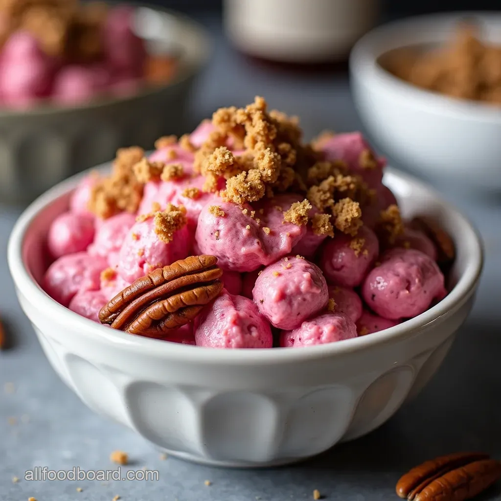 Transfer the assembled fluff into your chosen 8x8 inch dish or trifle bowl. Now, dollop the remaining cranberry swirl attractively across the top save this final, concentrated burst of color for presentation. Crucially, the toasted pecans should only be scattered over the top immediately before serving.