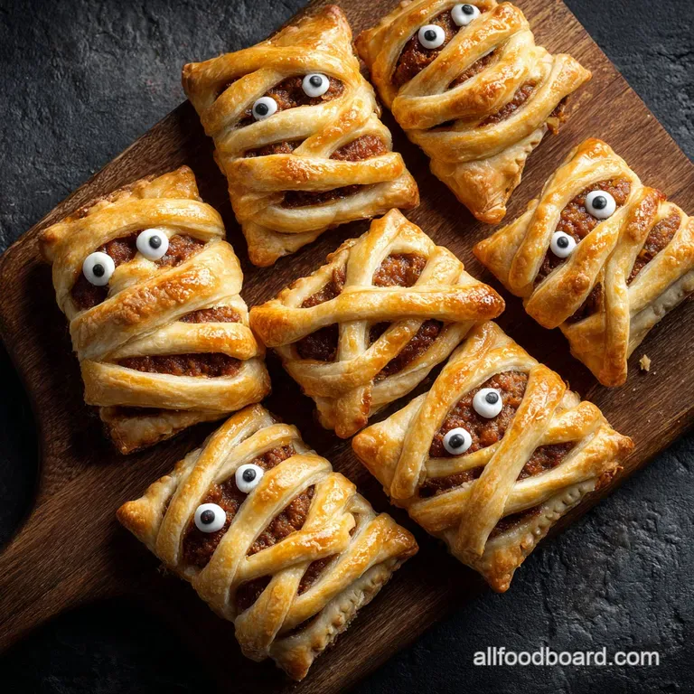 The genius of this dish lies entirely in the wrapping technique, which takes a potentially messy meat log and turns it into a ghoulish masterpiece. By using thin strips of cold pastry, you achieve that perfect, chaotic bandage look, ensuring every piece is unique.