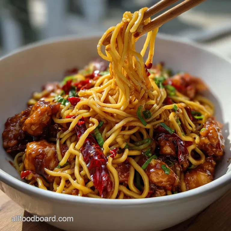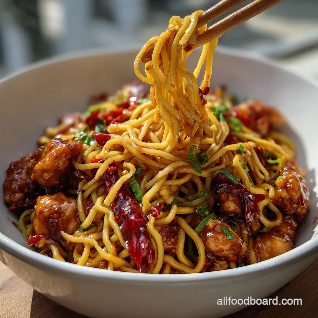When you add the noodles, don't stir gently toss vigorously but deliberately. You want the thick glaze to grab onto every strand. If the noodles seem dry, add a tablespoon of the reserved noodle cooking water (not plain water!) to loosen things up slightly before adding the chicken back in.